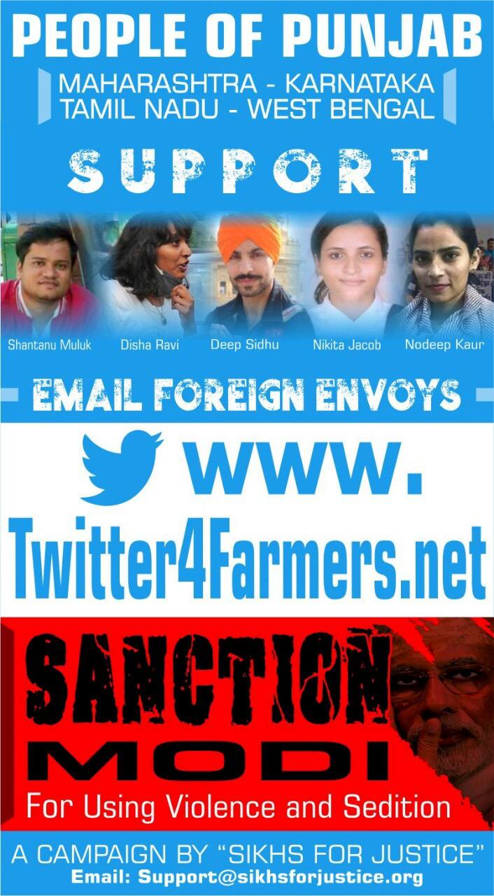 My name is . I am writing to urge your government to issue sanctions against the Modi regime which is using violence to suppress the ongoing farmer's protest and sedition charges to terrorize the supporters of farmers' rights.